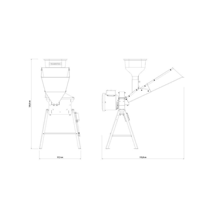 Equipado com funil para grãos e calha para pasto.