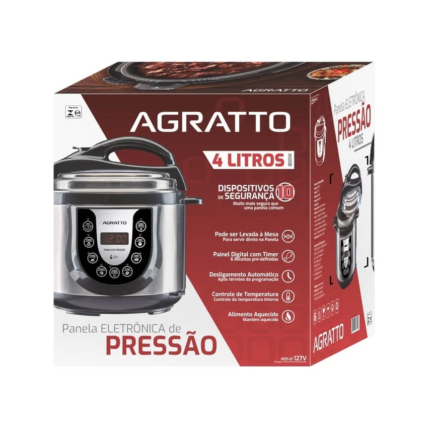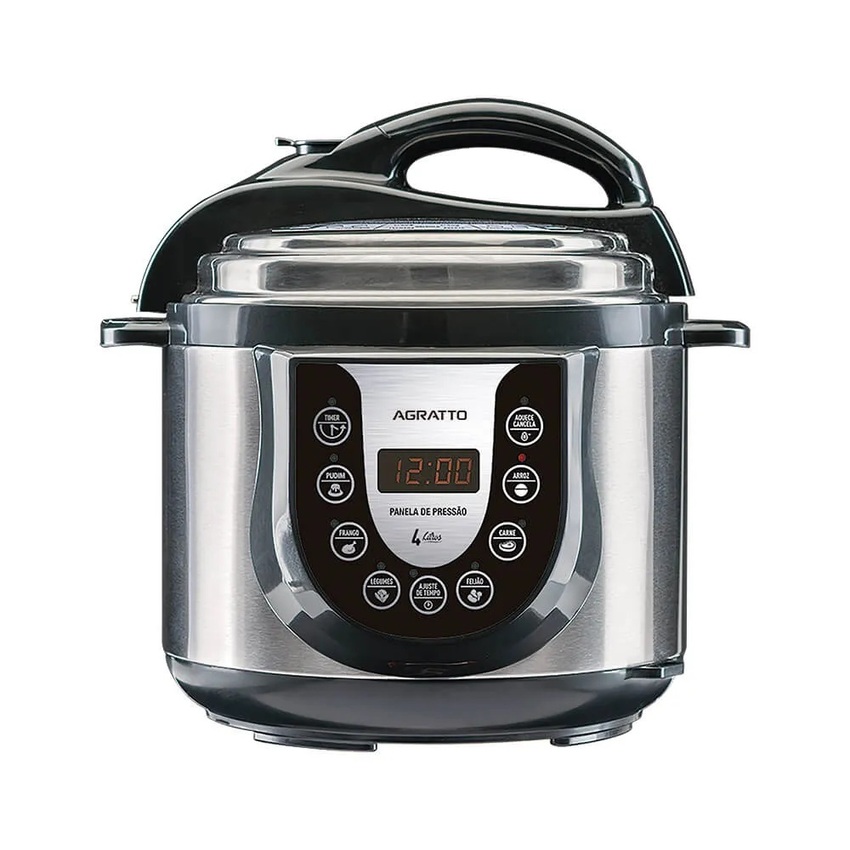 Travamento automático da tampa, pino de travamento, controle de pressão, válvula de alívio, cobertura anti-bloqueio, termostato, fusível térmico, estrutura reforçada e tampa de aço inox.