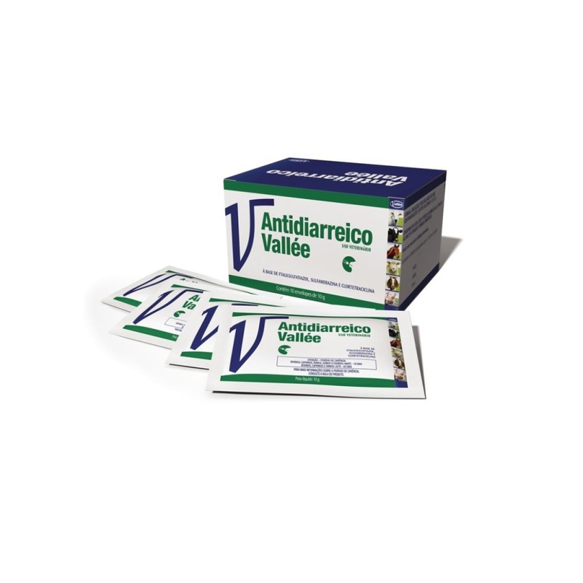 Antidiarreico Vallée é apresentado em cartuchos com 10 embalagens (tipo envelope) contendo 10 g cada.