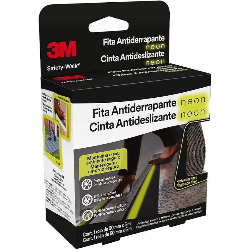 Esta Fita Antiderrapante 3M Neon é a mais completa solução de segurança para pisos, degraus, escadas, rampas, corredores e saídas de emergência. Além de prevenir quedas e escorregões por sua textura antiderrapante, ela possui uma faixa fosforescente emite luz por até seis horas durante a noite ou na falta de energia elétrica (necessita ter tido prévio contato com luz durante seis horas). Pode ser aplicada em áreas externas ou internas e é muito utilizada em residências que tenham idosos ou crianças. A Fita Antiderrapante Safety-Walk Neon é fácil de aplicar e cortar com tesoura. Além disso, seu adesivo é forte e resistente a chuvas e ao tráfego intenso de pessoas. É durável, confortável também para pés descalços, resiste a mofo e bolor e não racha ou descasca com o uso. Conheça essa faixa antiderrapante que necessita de baixa manutenção e otimiza o seu investimento! Disponível na versão 50 mm x 5 m.