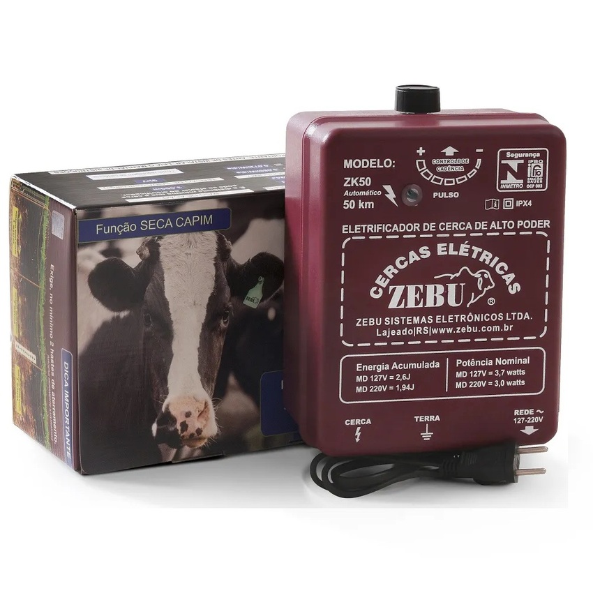O Eletrificador de Luz ZK50 Automático Zebu 3531 é um eletrificador de cerca rural bivolt, ideal para médias propriedades, que possui um raio de ação de 3.000 metros. Ele é projetado para eletrificar até 25 km de fio de cerca, adequado para animais de médio porte, como gado.